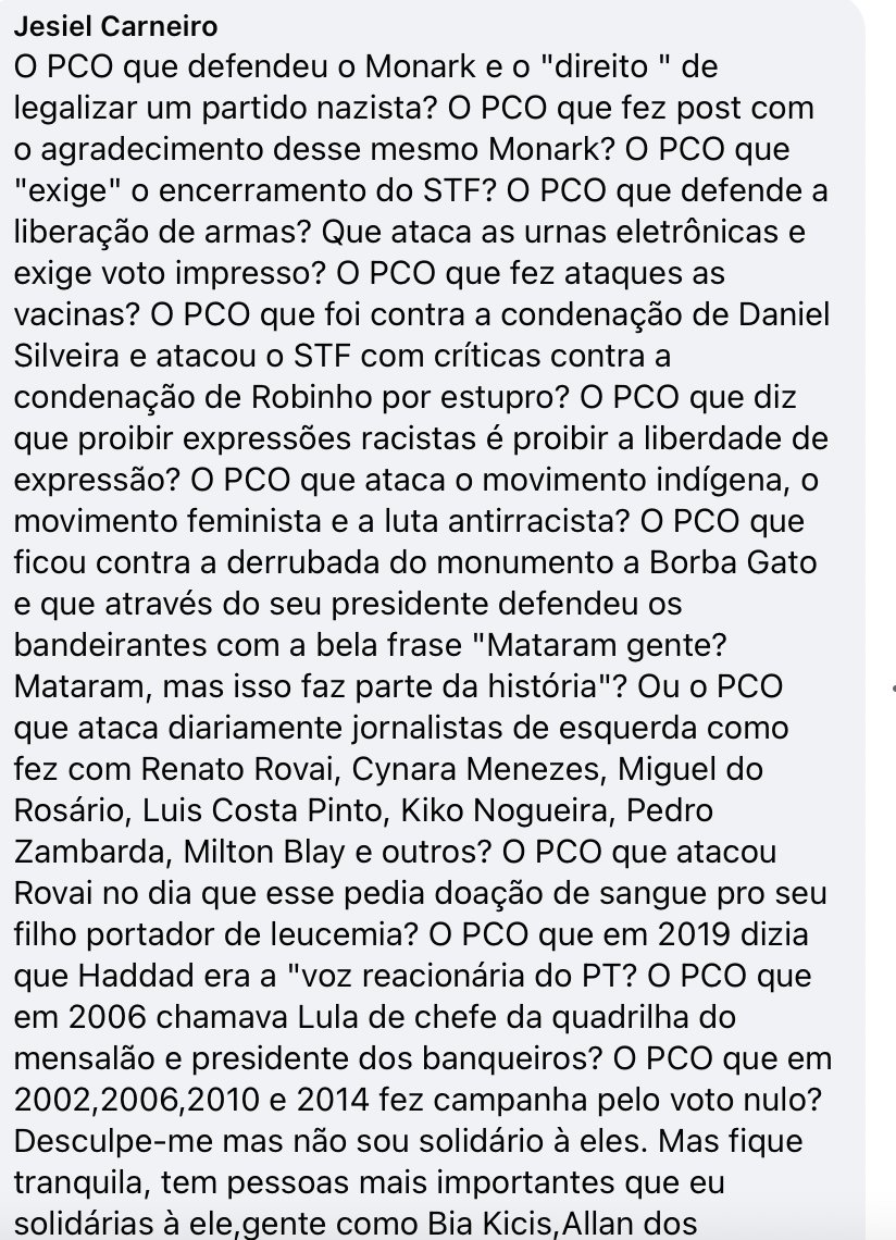 O PCO não defendeu o direito de legalizar um partido nazista, como se fôssemos partidários do nazismo e nem Monark o fez. Defendemos o direito de livre associação que aliás consta da Constituição de 88.. Monark nos agradeceu porque o defendemos contra uma injustiça. 2/segue