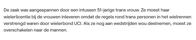 Omdat u onterecht denkt dat taal de realiteit schept, een aanpassing: Als HIJ nog aan wedstrijden wou deelnemen, moest HIJ overschakelen naar de mannen. Hoe klinkt dat? Sport wordt niet beoefend met genderidentiteiten en voornaamwoorden, maar met een geslachtelijk lichaam. /2