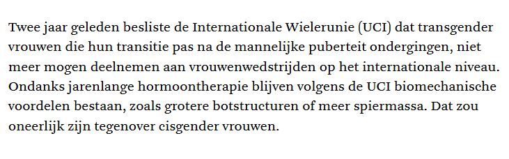 U mag de ‘zou’ hier gewoon weglaten hoor. Testosteronsuppressie heeft slechts een zeer beperkt effect op de onomkeerbare gevolgen van een mannelijke puberteit, met fysieke voordelen die voor vrouwen ontoegankelijk zijn. Je kan een ei nu eenmaal niet ‘ontkoken’. /2