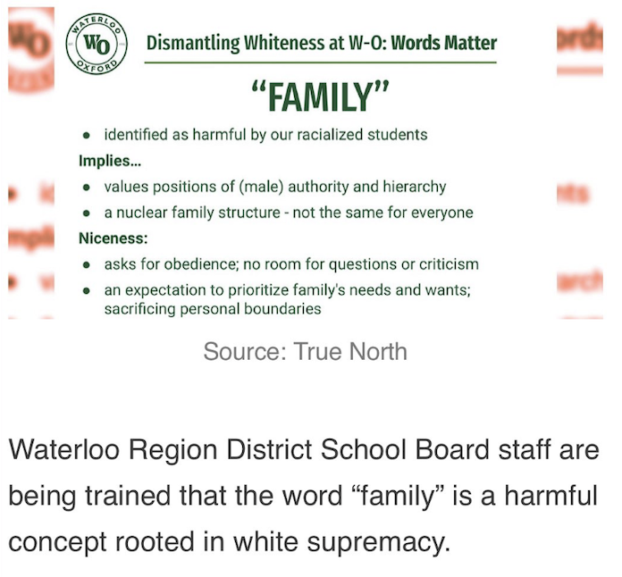 "The word family is a harmful concept rooted in white supremacy" says the Waterloo Region District School Board.