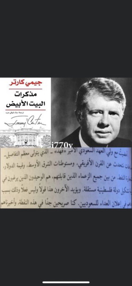 ▪️"وقد أشار الرئيس كارتر إلى أن الزعماء السعوديين كانوا الوحيدين من بين الزعماء العرب الذين وقفوا هذا الموقف بخصوص الدولة الفلسطينية، في حين أن زعماء عربآ آخرين فضلوا في محادثاتهم الرسمية حلا أقل جذرية"
