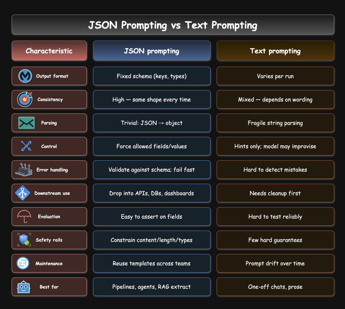 JSON prompting is a way of asking an LLM using a clear, structured format (with keys and values) and expecting the response in the same structured style.