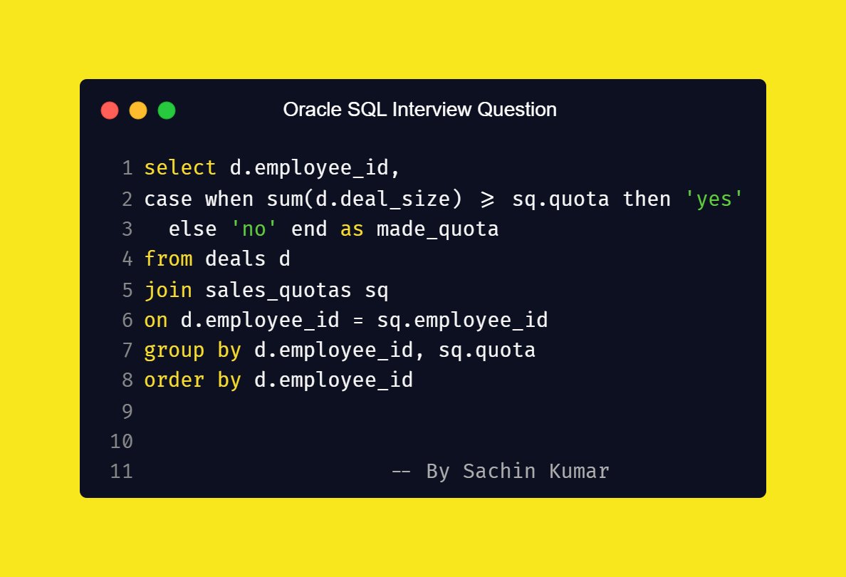 Q) As a data analyst on @Oracle Sales Operations team, you are given a list of salespeople’s deals, & annual quota they need to hit.
