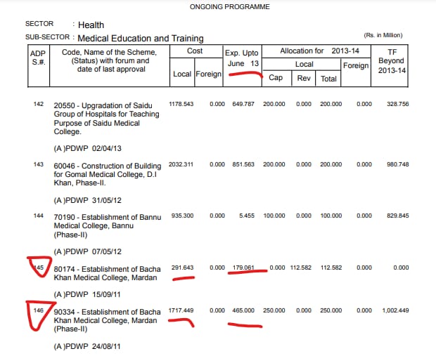 2. ADP 2013-14 document downloaded from here pndkp.gov.pk/download/kp-ad… shows that the project ID 90334 of Bacha Khan Medical College was approved on 24/08/2011 with a total cost of Rs 1717.449 million. Uptil June 2013, the ANP govt spent Rs 465 million as required for it.