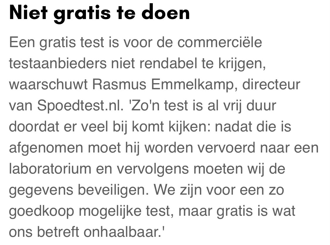 https://twitter.com/debroervanroos/status/1393112618123026433Ongelooflijk dat er uberhaupt geluisterd wordt naar een of andere testboer, met zijn woekerprijzen. Al die gasten zijn notoire hosselaars, die voor corona al goedlopende zaken hadden. En dan naar dat soort autoschooljongens luisteren, het is een gotspe.