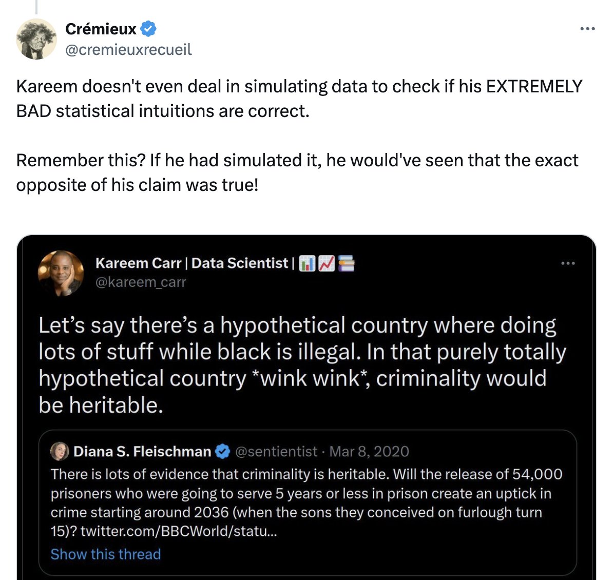 https://twitter.com/charlesmurray/status/1968053071847760235Revealing in that it shows how quantitative racism is a just an exercise in manipulating data to fit the preconceived conclusion. Disturbing because this time private data is being used and the results, which cannot be easily verified, are just flatly invented.