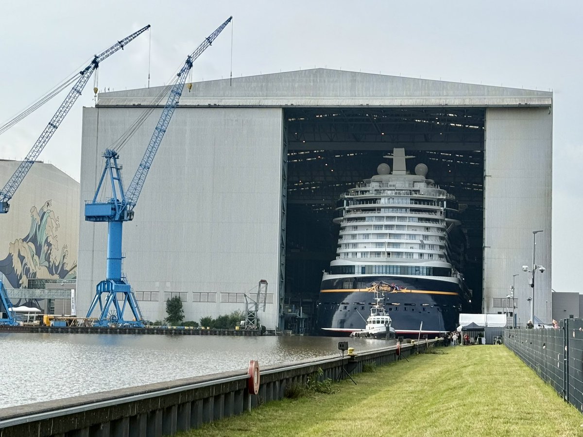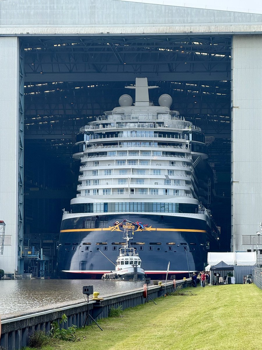 The Disney Destiny is now leaving Hall 6 at MEYER WERFT, floating out of the shipyard and into the harbor for the first time. Disney’s newest ship will make its official debut in November.