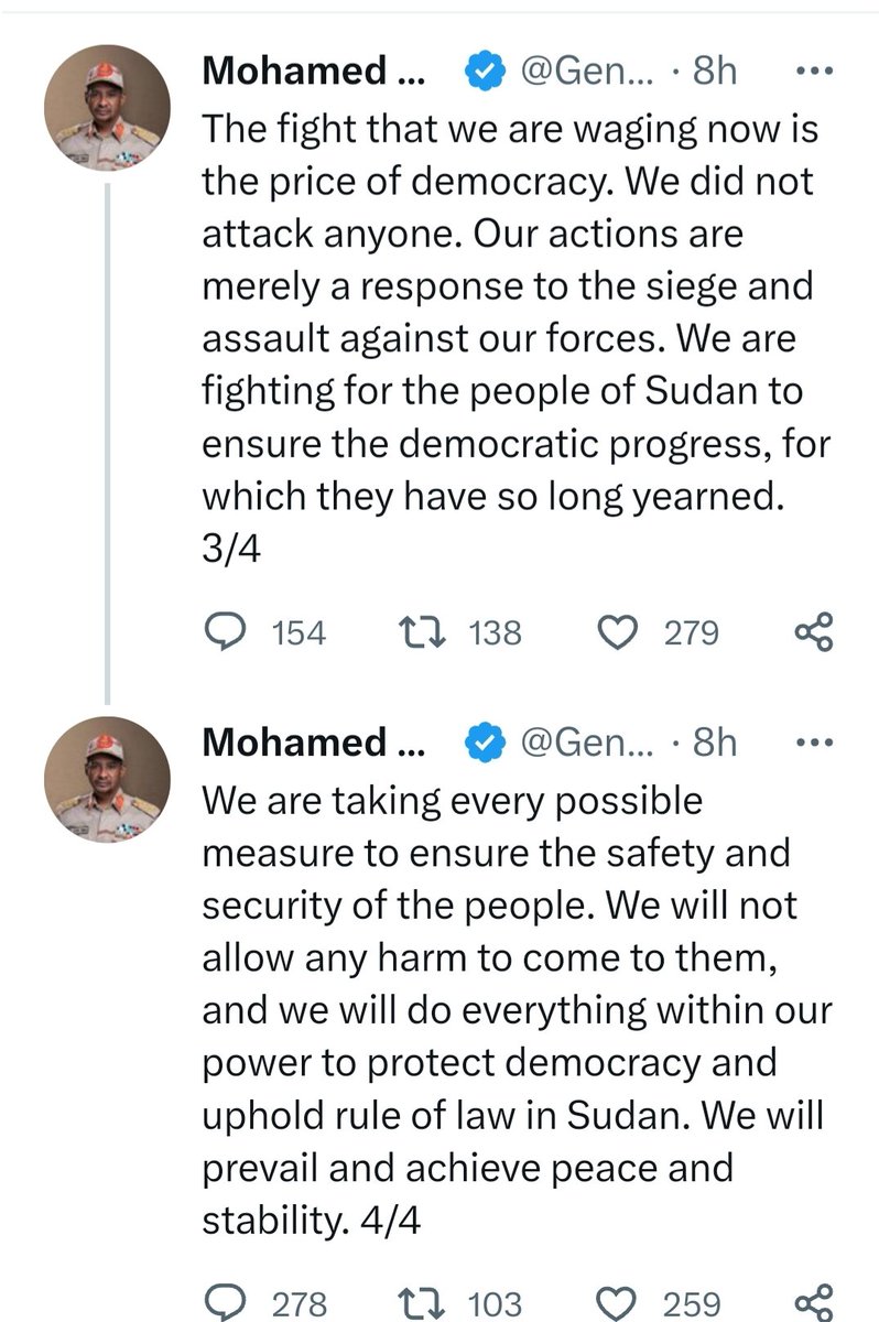 Hemedti and Burhan are not opponents on any principle. They may be fighting for power at the centre, but it's a fight over distribution. Civilians and soldiers are collateral damage. Typical political marketplace behaviour. Everyone outside Khartum has seen it before.