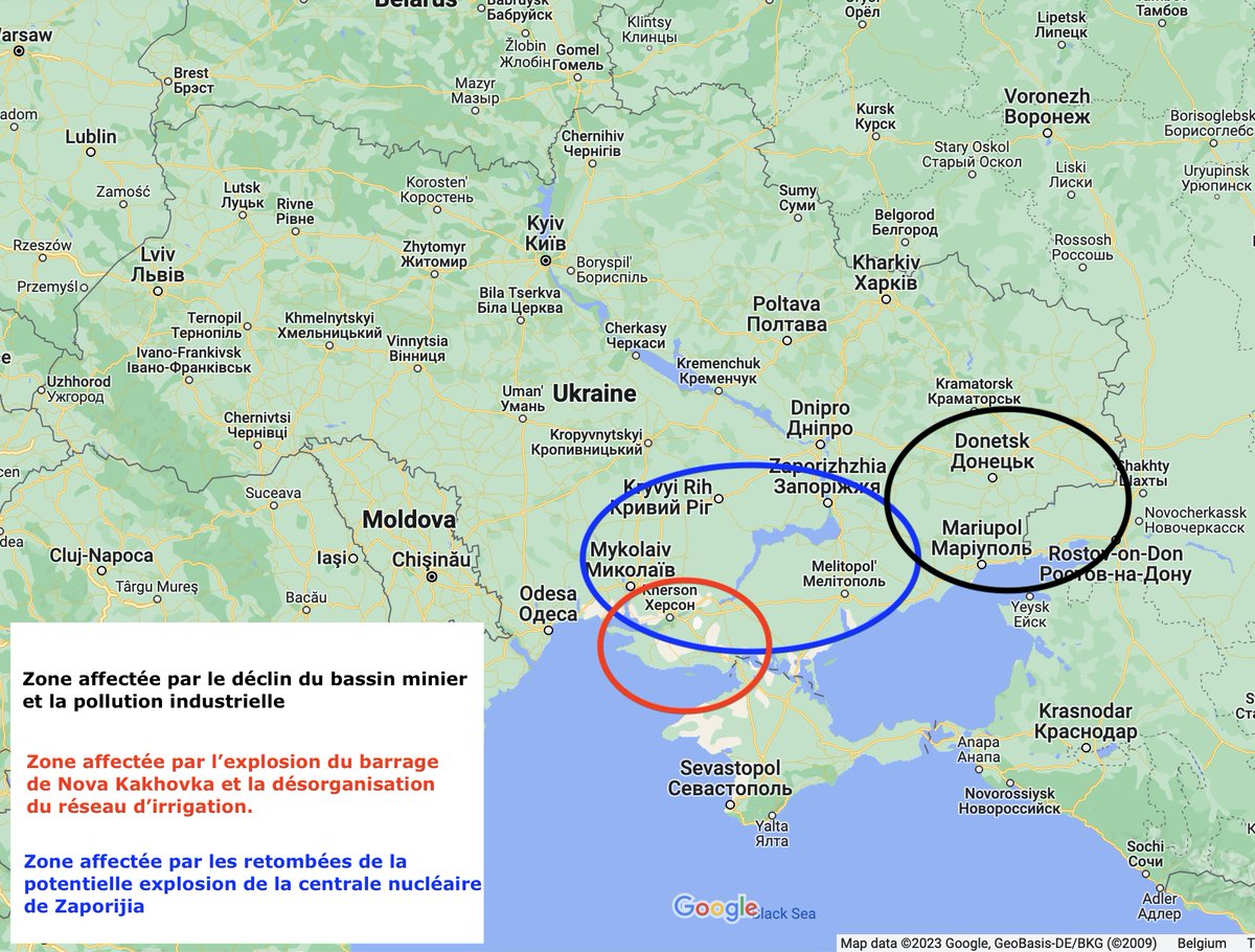 On parle évidemment de la zone dévastée par l’explosion du barrage de Nova Kakhovka mais aussi du Donbass occupé. Dans le cas d’une explosion de Zaporijia, une sorte de lien territorial sera alors établi entre ces régions, contaminées de différentes manières. 2/