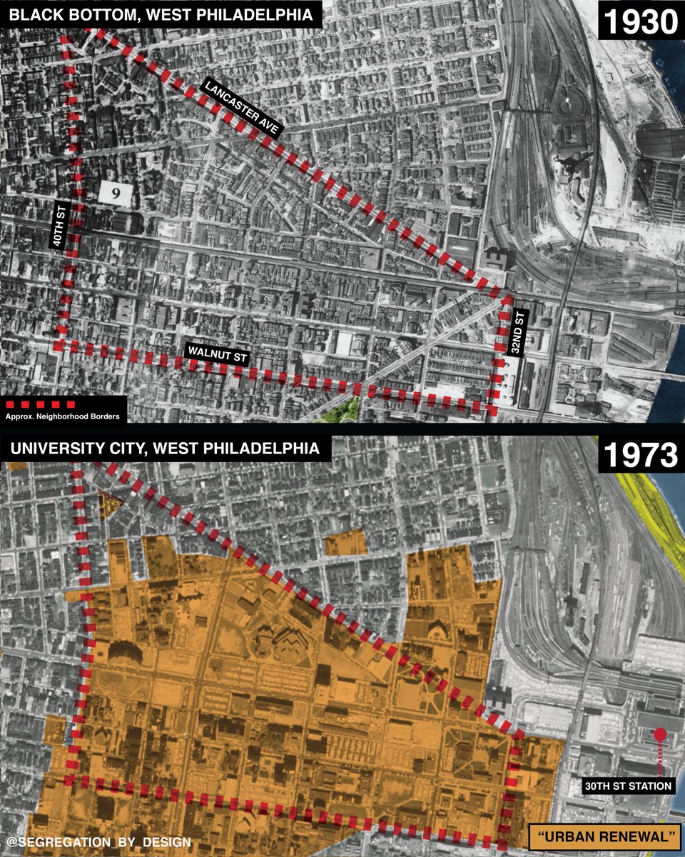 Black Bottom is outlined in this colorized 1939 photo. Despite the organization and protest from local residents and sympathetic students, ultimately the neighborhood was lost to the “federal bulldozer” of urban renewal. James Baldwin noted: “Urban renewal means Negro removal.”