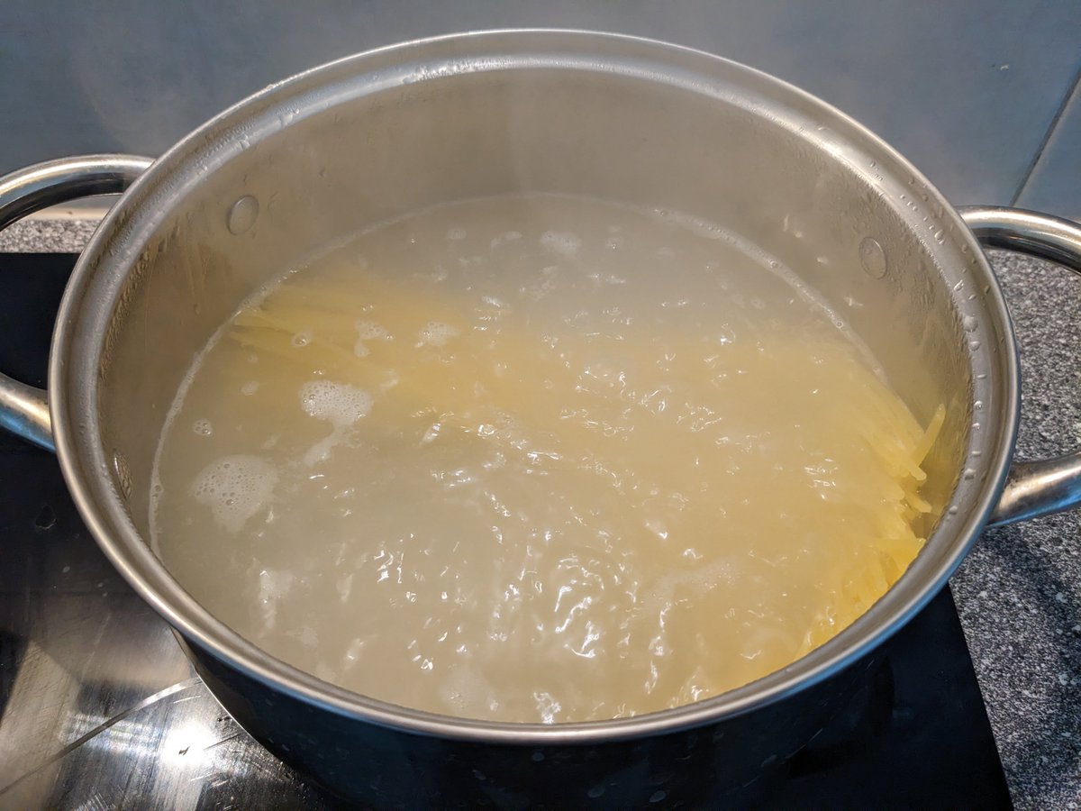 I used 200g spaghetti. This was enough for myself. Cooked for 7 minutes. Just a little before it became al dente.