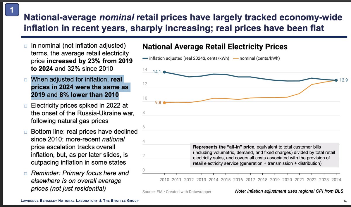 When adjusted for inflation, national avg. retail electricity real prices in 2024 were the same as 2019 and 8% lower than 2010