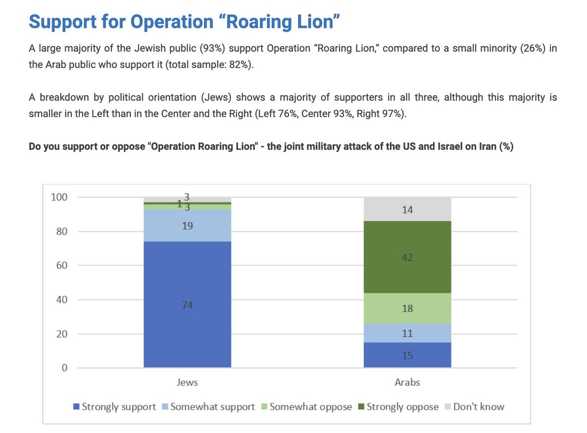 Among Jewish Israeli citizens, support for the US-Israeli aggression is at 93%. From those who identify as belonging to the right there is 97% support, 93% support from the self-identified center, and 76% from the so-called Israeli left support this joint attack on Iran. 2/13
