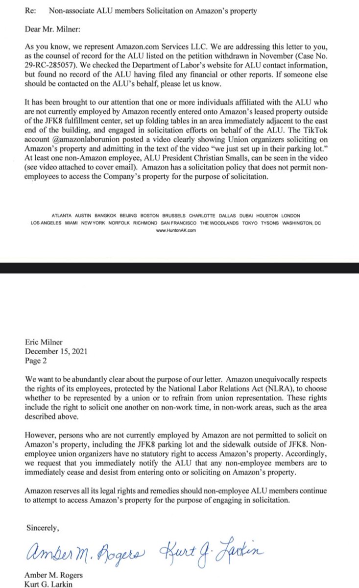 up handing out food and ALU shirts.Managers in passing questioned our set up one even said WTF* is this to an organizer the next morning @amazon sent this letter to the NLRB Director about our Tiktok video which clearly shows a bus depot in the background threatening myself