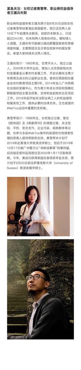 Guangzhou-based labor and women’s rights activists Sophia Huang Xueqin and Wang Jianbing went missing Sunday, Sept. 19. Their friends fear detention. 1/5