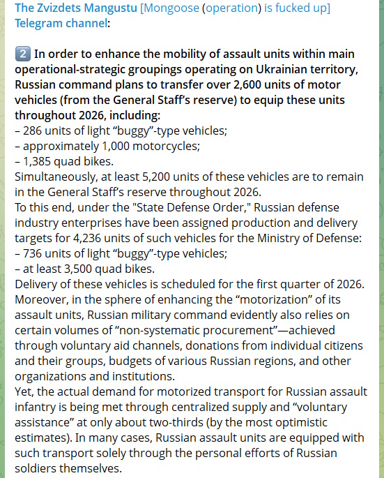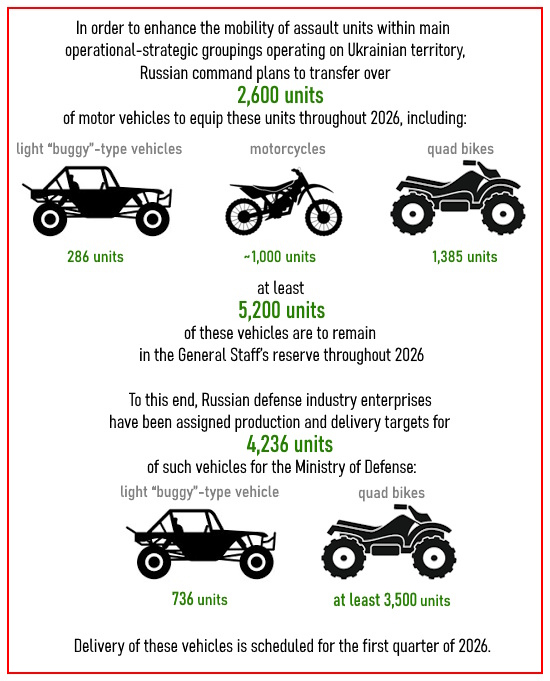 Russia is delivering 2,600+ motor vehicles to boost assault unit mobility in 2026, with additional production & voluntary donations, but supply still meets only ~65% demand, leaving many units reliant on soldier-initiated solutions.