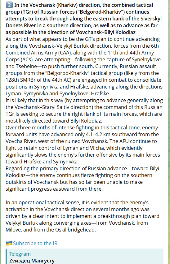 In the Vovchansk (Kharkiv) direction, the RuAF, after over a month of attacks west of Vovchansk, have achieved limited progress within the town, as well as toward key highways, aiming to flank and disrupt 🇺🇦defenses.