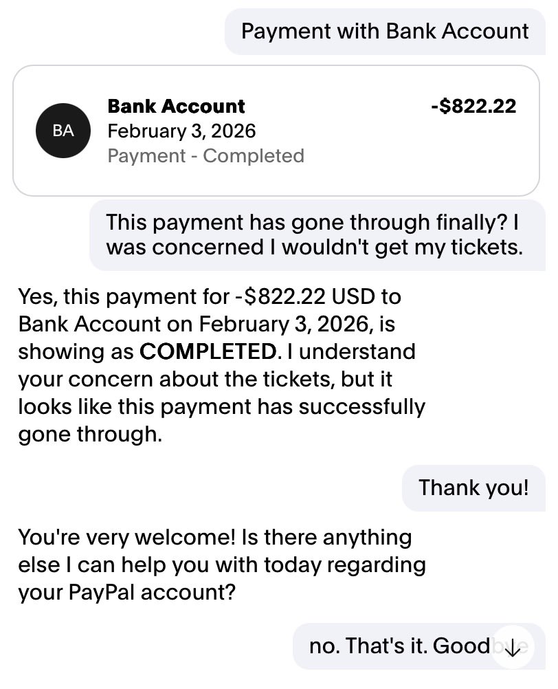 ARMY. Check your bank receipts, especially if you paid through PayPal. I just had a wild Ticketmaster experience. I paid for tickets on 1/22. I received the tickets. I received a PayPal notification on 1/27 that my bank payment had been declined. I saw the email today and chatted