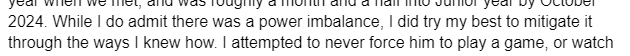 You have infact admitted that there was a power imbalance dynamic at play. Your other points saying you 'attempted to never force me into anything', does not make this any better, considering the coercion.