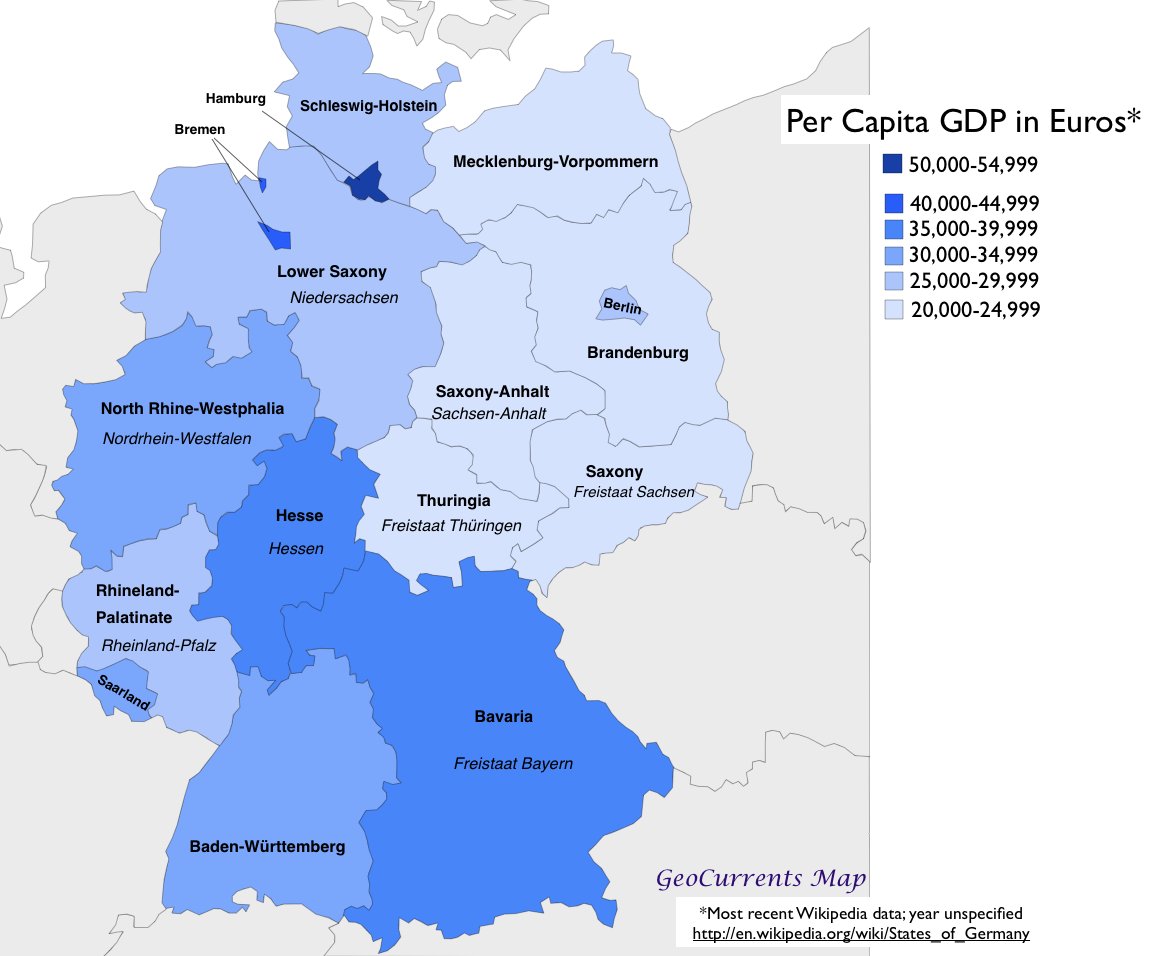 Puede que algo tenga que ver que durante 40 años la zona menos rica fuera parte de la RDA. El problema es establecer una relación de causalidad. Precisamente muestro estos mapas que refutan esas relaciones que Max Weber (alemán, para más inri) quería ver en su obra de 1905.