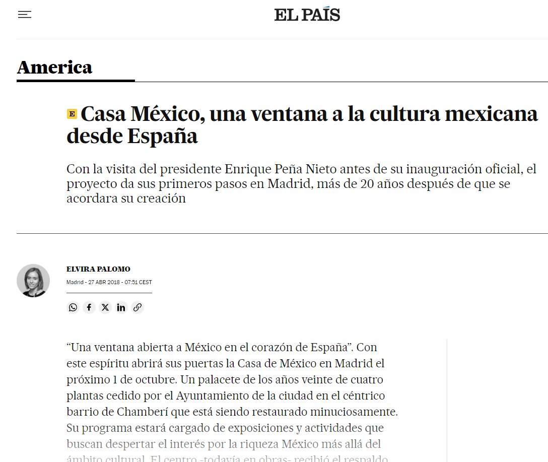 El 1 de Octubre de 2018 se inaugura la Fundación Casa de México en España con la presencia de muchas autoridades, entre ellas, el ministro de Asuntos Exteriores español, Josep Borrell y la alcaldesa Manuela Carmena.