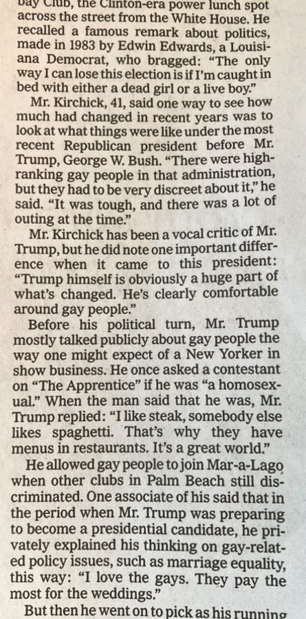 Trump “once asked a contestant on ‘The Apprentice’ if he was ‘a homosexual.’ When the man said that he was, Mr. Trump replied: ‘I like steak, somebody else likes spaghetti. That’s why they have menus in restaurants. It’s a beautiful world.’” 😭😭