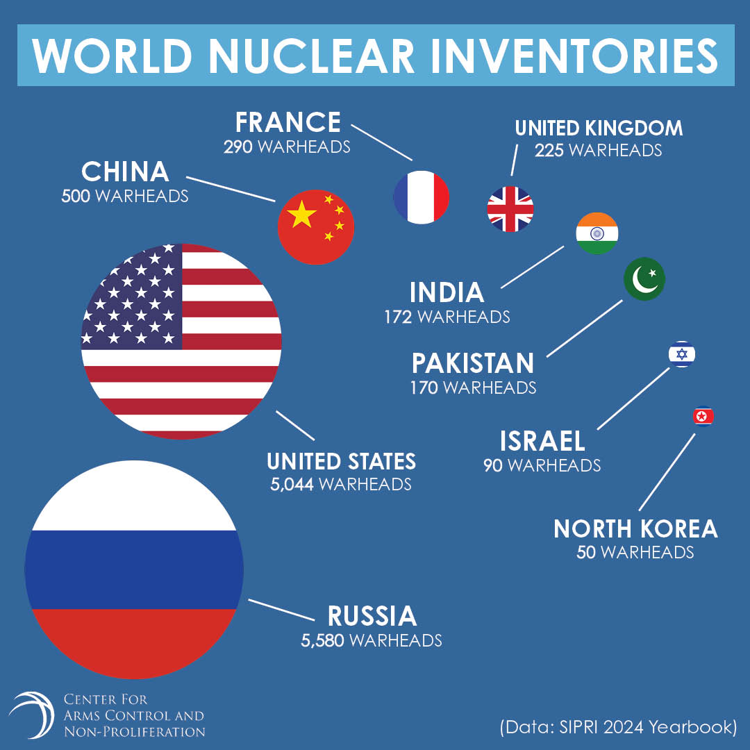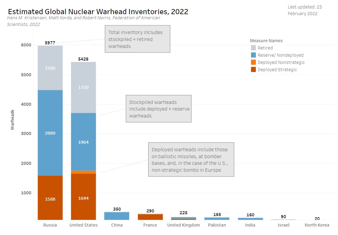 The United States has a "first use policy" and has 5,428 nuclear warheads in its arsenal. There are 3,708 active warheads and 1,744 HOT deployed strategic warheads. In comparison, China has a "no first use" policy with only 350 non-deployed warheads