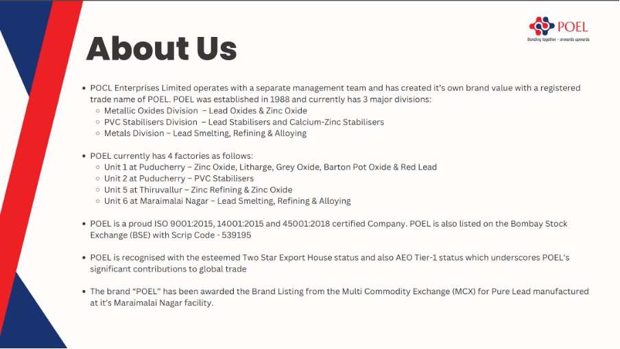 Founded in 1988, POCL Enterprises Limited is a manufacturer and supplier of non-ferrous metals and specialty chemicals, serving industries such as automotive, electronics, energy, and infrastructure,with a strong presence in lead, zinc, and PVC stabilizers.