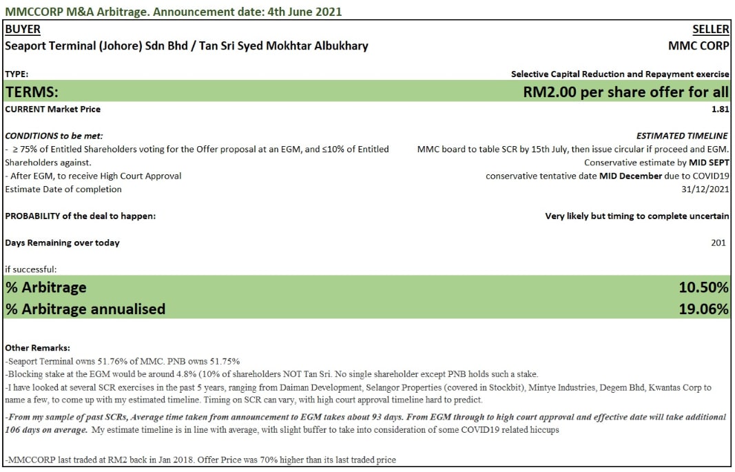 "MMCCorp was to be taken over by its owner Tan Sri Syed Mokhtar by way of SCR.. This deal will take longer due as Timing of SCR can drag, with high court approval timeline being hard to predict..
