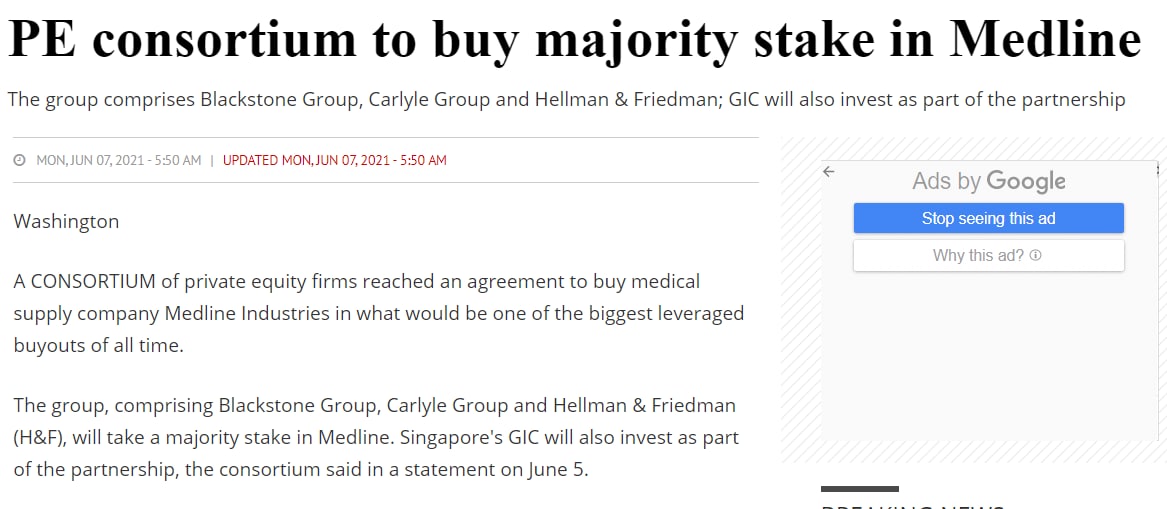 "A private equity group comprises of Blackstone, Carlyle Group and Hellman & Friedman; Abu Dhabi Investment Authority and Singapore GIC reached an agreement to buy private medical supply company Medline Industries in what would be one of the biggest leveraged buyouts of all time.
