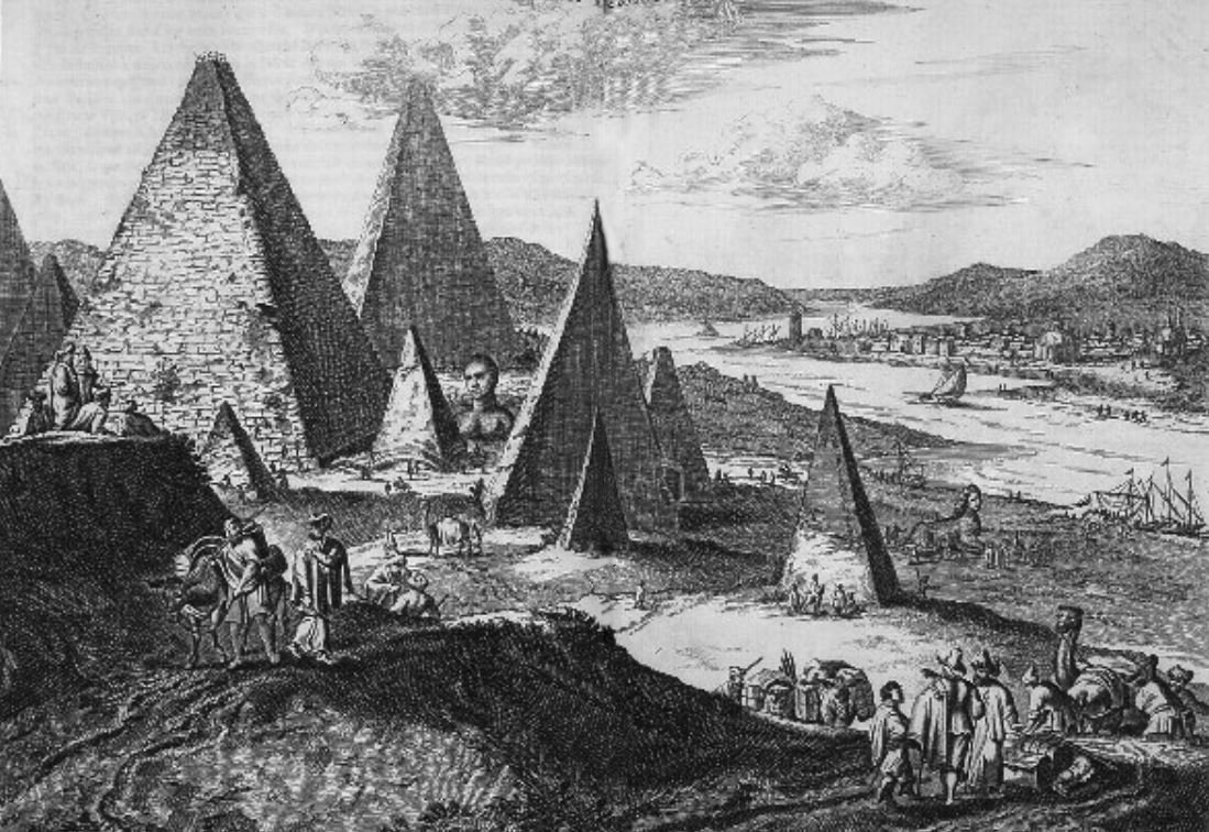 Below is the very first (western) depiction of the Sphinx in 1579 (she was rather buxom back then). Then a sketch in 1665, the year before London's Great Fire. The Pyramids seem peculiar until compared with a photo of those in Sudan!