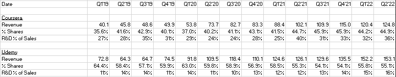 1/x Some thoughts on Coursera $COUR vs Udemy $UDMY. Udemy currently trades at an enterprise value of $1,723mm (2.75x EV/FY'22 Sales) vs Coursera's of $1,048mm (2.05x EV/FY'22 Sales). Both platforms offer free and paid educational courses online. DM for full models on both.