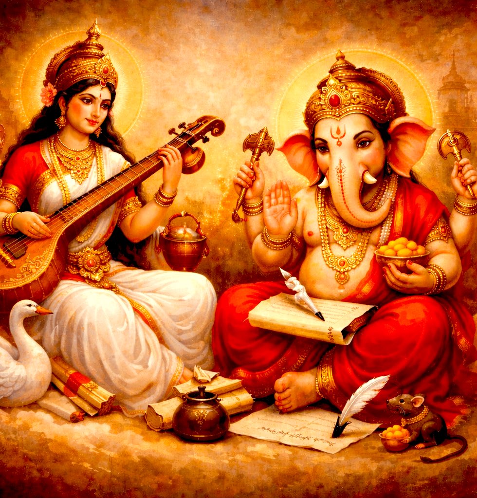 In Sanatana Dharma, students begin their studies by invoking both Maa Saraswati and Bhagwan Ganesha.