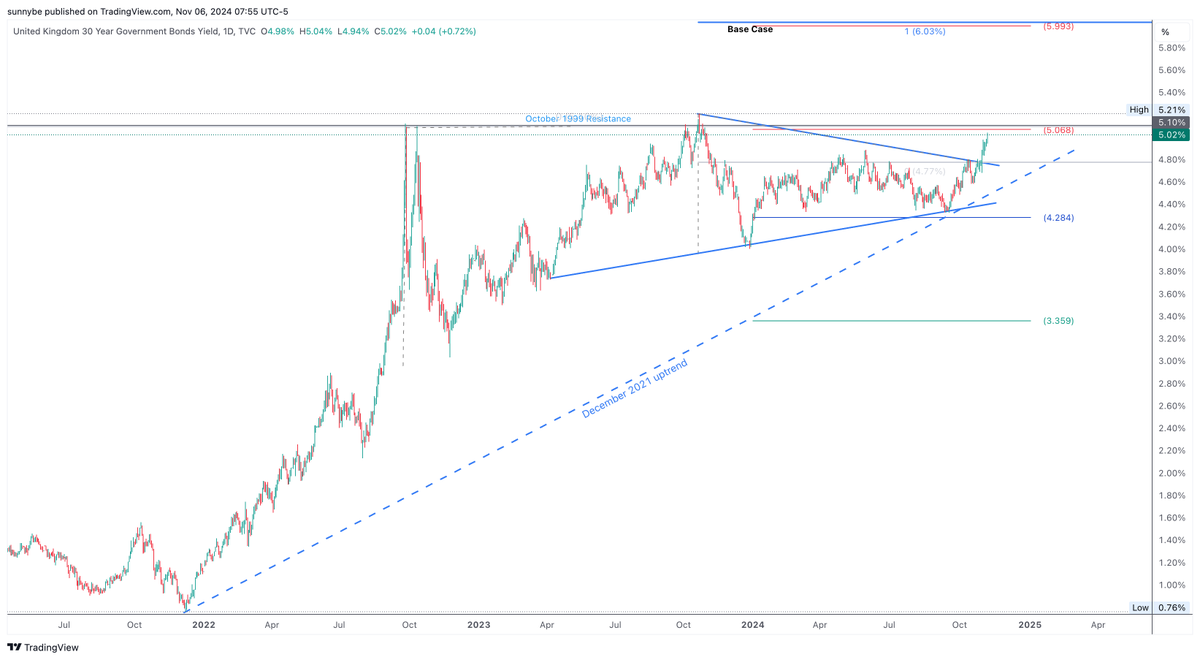 If I am wrong on the UK 30-year Yields we see 5.23% (October 2023 highs)