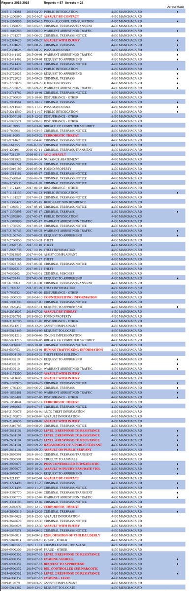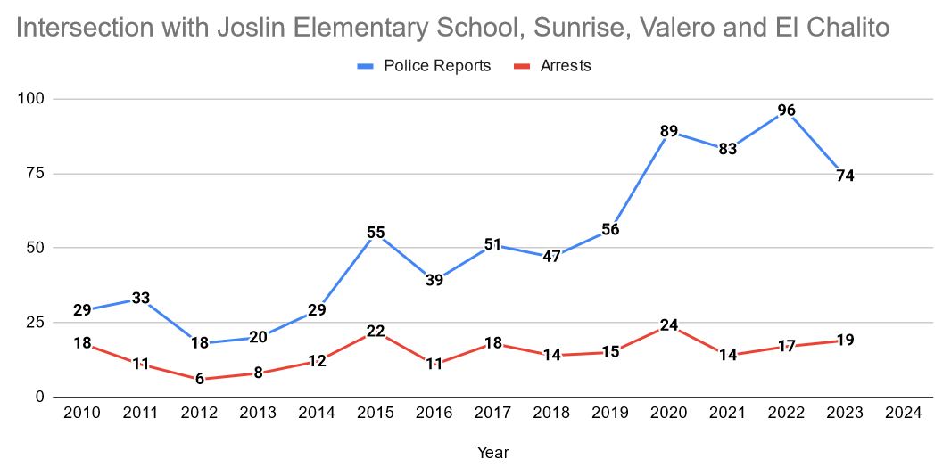 correlation between the opening year and a significant jump of 89% in the number of police reports filed at 4 addresses. From 2014(the year prior to Sunrise opening) to 2022 there was an 231% increase in police reports filed for all 4 addresses.