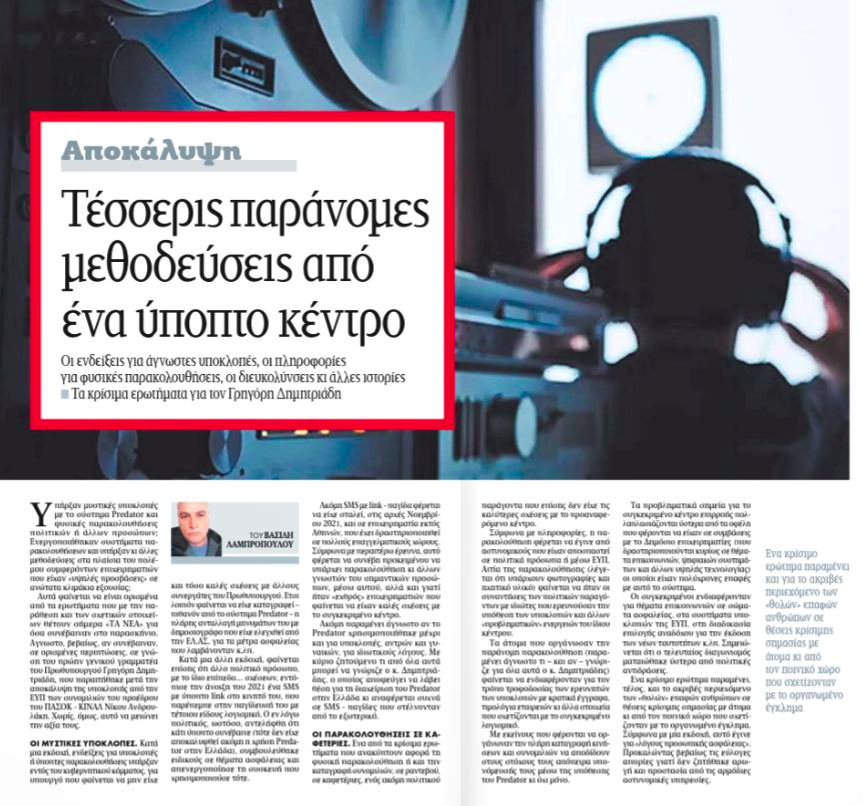 >Θύματα παρακολούθησης: ένας υπουργός της παρούσας κυβέρνησης (φωτογραφίζεται ο Χρυσοχοϊδης), ένα πολιτικό πρόσωπο, ένας επιχειρηματίας, ένας πολιτικός παράγοντας. Κεντρικό ρόλο φαίνεται να παίζει επιχειρηματίας, που πάλι δεν ονοματίζεται, σαφώς πρόκειται για τον Γιάννη Λαβράνο.>