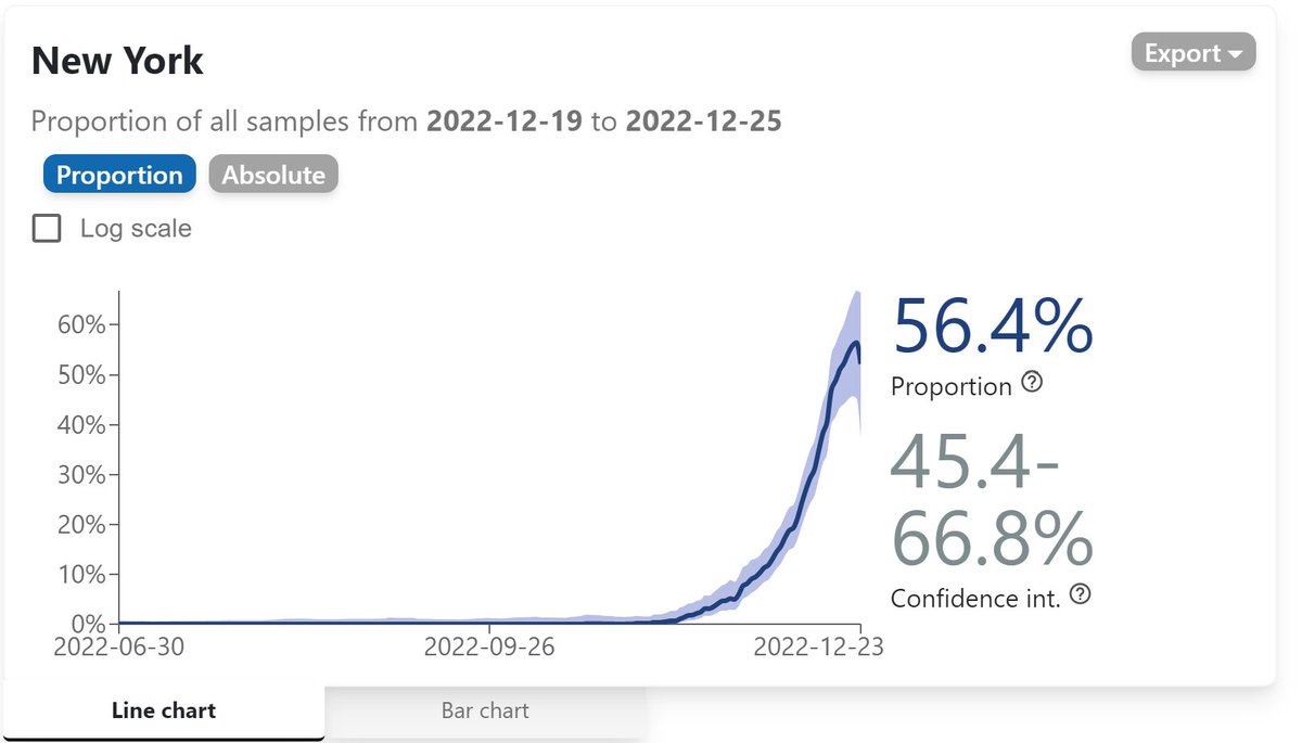 https://twitter.com/BallouxFrancois/status/1609095339604148226...which misclassifies most XBB.1.5* as XBB.1 or BA.2. The actual GISAID data, using Nextclade Pangolin XBB.1.5% show it is indeed at 40% already in the US & at 56% in New York state. It has a logistic growth rate of 0.14 per day, which is very fast. cov-spectrum.org/explore/United…