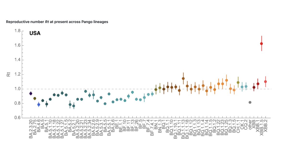https://twitter.com/MoritzGerstung/status/1610271191188623362Here is the current daily growth rate advantage (in % per day) of different variants relative to the dominant type BQ.1*. XBB.1.5* is the clear winner & this initial advantage is at least as large than the one that BQ.1* had at an equivalent share in the population.