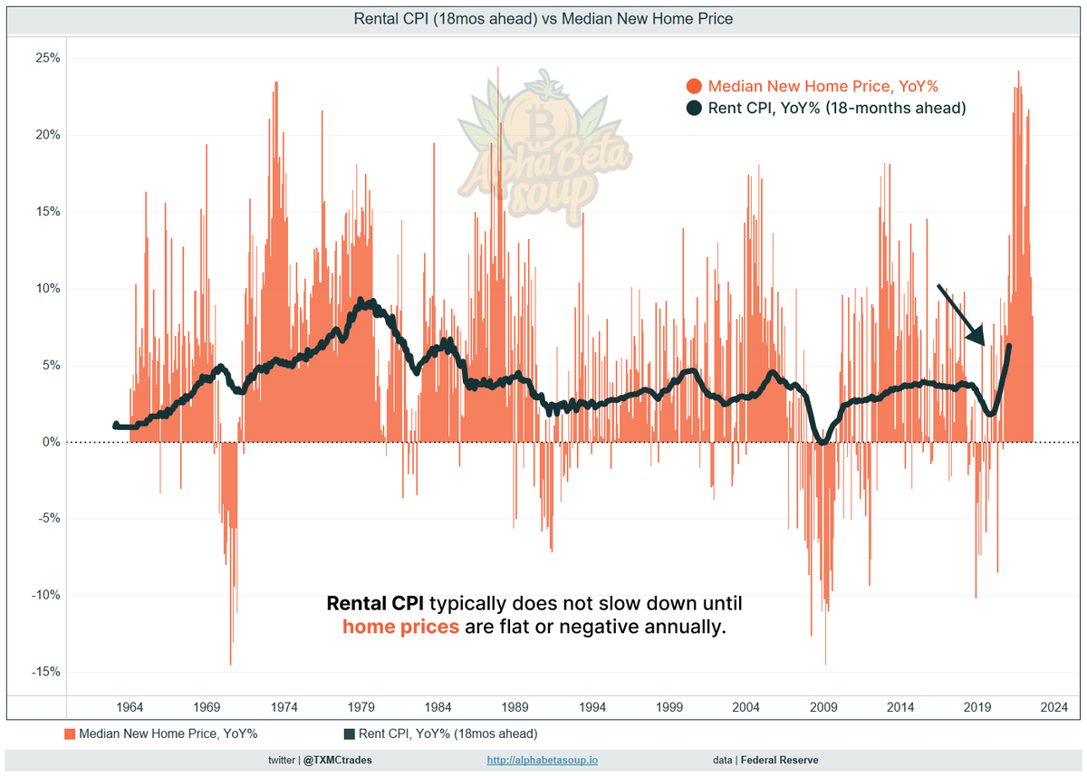 We begin with ⚫️rent CPI (18mos ahead) vs 🟠median new home prices annually.