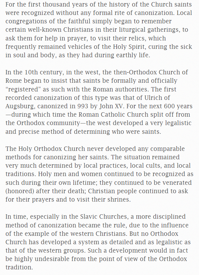 Historically speaking the current exact process of the glorification of saints in Roman Catholicism isn't found in the early Church, its 1st inkling didn't appear till near the start of the Second Millennium & is foreign to the Eastern Orthodox tradition