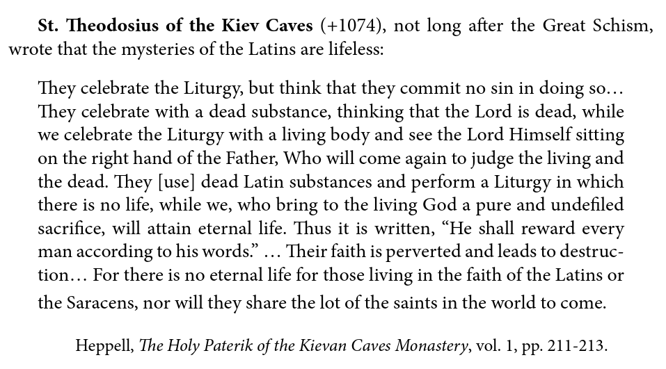 Claim: "Russian saints before Florence are Catholic unless proven otherwise." This demonstrates a great ignorance of the period. There are many examples besides St Theodosius showing Kievan Rus' ecclesiastical authorities shortly after 1054 recognize schism & heresy among Latins.