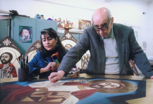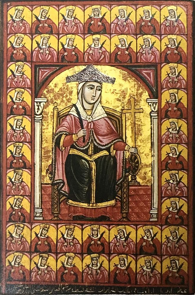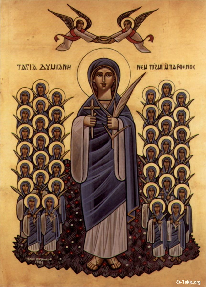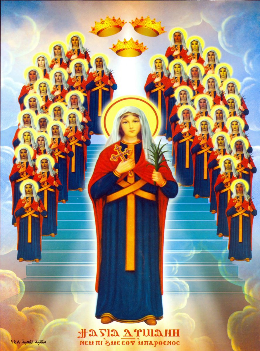 This contemporary Coptic icon (1st image) of St Demiana & the 40 Virgins is distributed in Egypt. A big version can be seen in The Convent of Saint Damiana in the Nile Delta of Egypt. 1st image looks Roman Catholic. 2nd is traditional Coptic. 3rd is Neocoptic. 4th is contemporary