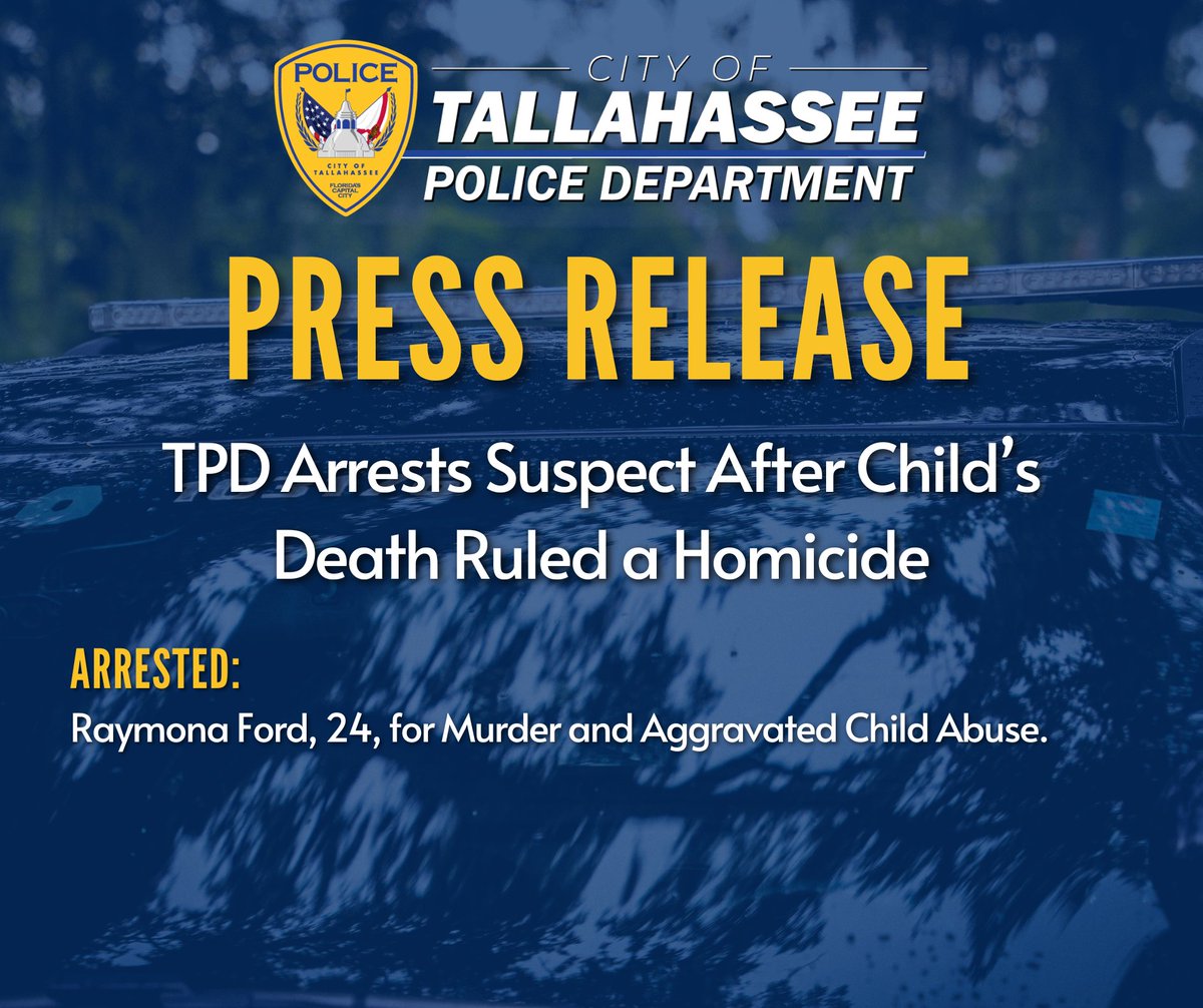 The Tallahassee Police Department (TPD) has arrested 24-year-old Raymona Ford in connection with the death of a 2-year-old boy, following a months-long investigation that determined the child’s drowning was a result of foul play. (2) On May 9, officers responded to the Magnolia Terrace Apartments in reference to a child who had reportedly drowned in a bathtub. Upon arrival, first responders immediately began life-saving efforts before transporting the child to a local hospital in critical condition.