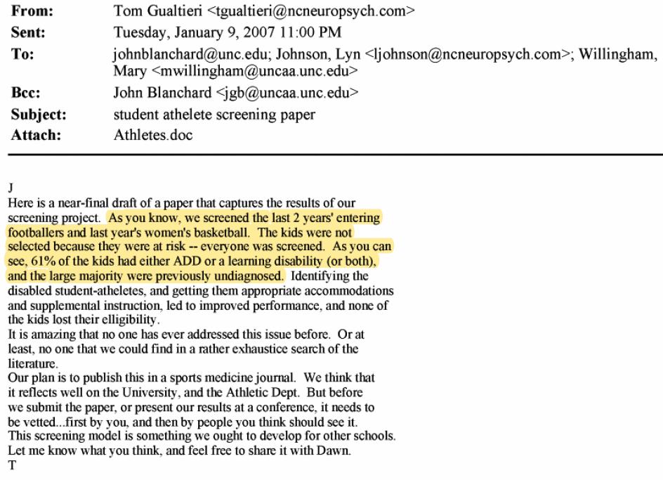 @UNC@TheAthletic The email from Dr. Thomas Gualtieri discussing the 61% LD/ADHD prevalence among incoming FB/WBB athletes in 2 incoming cohorts.