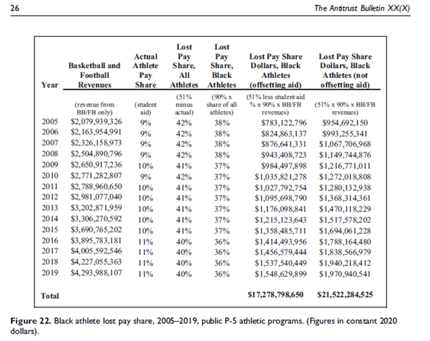 To estimate the revenue loss to Black athletes under the NCAA cartel, we use the athlete wage share & Black athlete revenue share of total salaries in the NBA (~90%). We estimate Black athletes’ lost pay share at between $17-$21 billion over the 2005-2019 period. 2/n