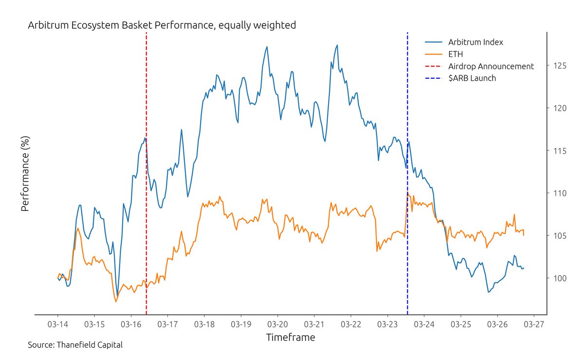 2/ For this analysis, we've created an equally weighted basket of Arbitrum ecosystem tokens, consisting of the most important native assets.