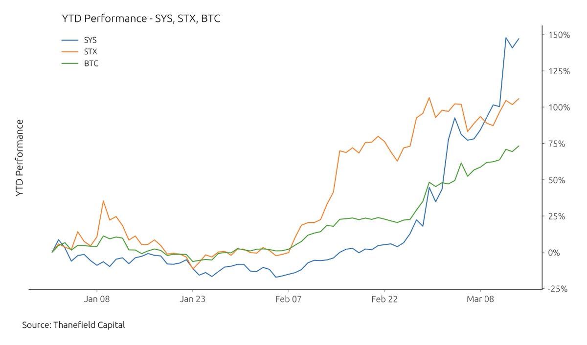 Of the projects with existing tokens, we highlight $STX (@Stacks) and $SYS (@syscoin), both of which have traded as beta to bitcoin and have significantly outperformed BTC YTD.