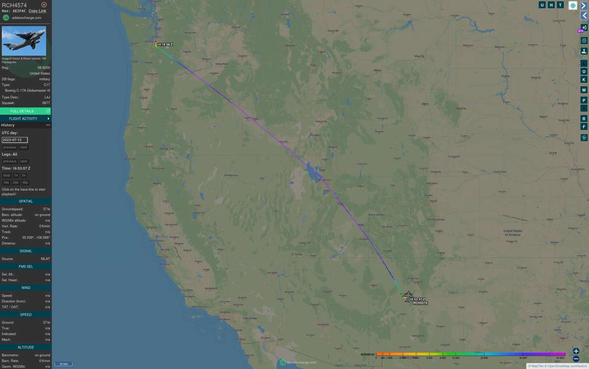 https://x.com/TheIntelFrog/status/1911986687451725934On July 15th, US Air Force C-17A Globemaster III #AE2FAC as RCH4574 from the 62nd Airlift Wing arrived at Kirtland AFB, NM from McChord AFB, WA.