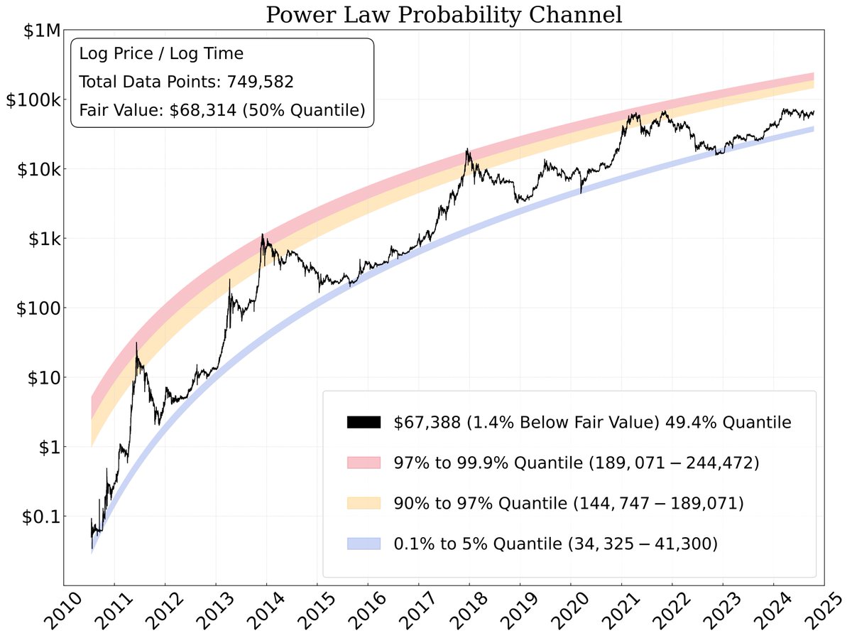 For anyone wondering, this is quite different from the rainbow chart. The data follows a log-log relationship with quantile regressions, whereas the rainbow chart uses logarithmic regression with a log-linear relationship.