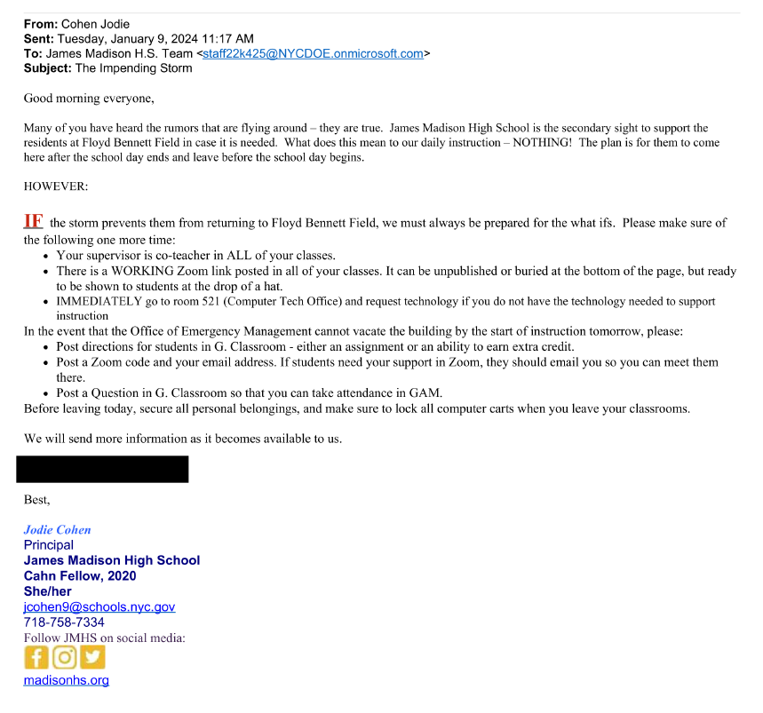 JMHS Principal Jodie Cohen was alerted to the possibility of using the school as a site to evacuate illegal immigrants housed at Floyd Bennett Field on the morning of January 9.